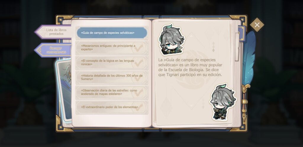 Después de devolver cada libro a su sección correspondiente, puedes obtener tus premios en la opción Lista de lectura Reclamar recompensas en la esquina izquierda de la pantalla. Obtienes un total de x40 Protogemas, x3 Fragmentos de esmeralda de Nagadus, x20000 Mora y x2 Minerales de mejora mística por ello. Nada diferente de los obsequios habituales de los eventos web.