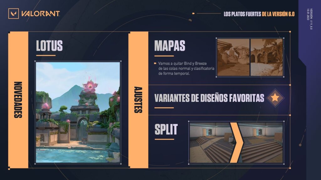 El nuevo mapa, Lotus, se desarrolla en las antiguas y misteriosas ruinas que se ven en el tráiler más reciente de REVELATION. Lotus será un mapa de tres sitios, lo que lo convierte en el segundo mapa de Valorant que cuenta con tres sitios separados para plantar la estaca. Lotus solo se podrá jugar en el nuevo modo de juego Swiftplay durante la primera semana de lanzamiento y entrará en los grupos de mapas Competitivo y Sin clasificar en el lanzamiento del parche 6.1.